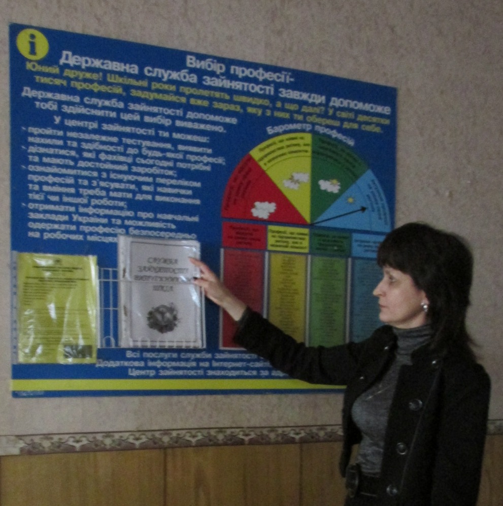Фахівці підготували цікаві й пізнавальні матеріали для використання на уроках основ вибору професії та передані вчителям, надані диски з профдіагностичним тестуванням, зразки написання резюме, ознайомлено учнів з переліком центрів професійно-технічної освіти, в яких можна здобути спеціальність за сприяння служби зайнятості.